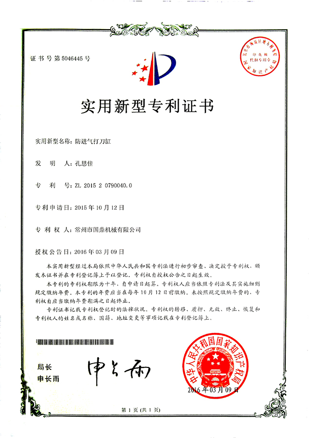 《防進(jìn)氣打刀缸》專(zhuān)利證書(shū)
